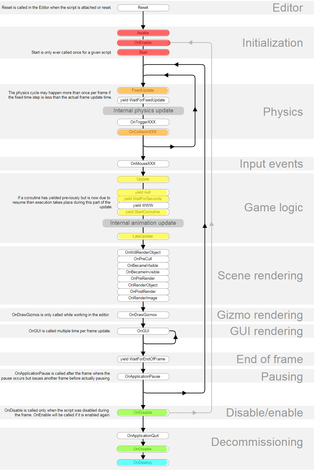 Unity 스크립팅시, 미리 정의된 순서대로 실행되는 많은 이벤트 함수가 있습니다. 아래에서는, 실행 순서를 설명합니다.
