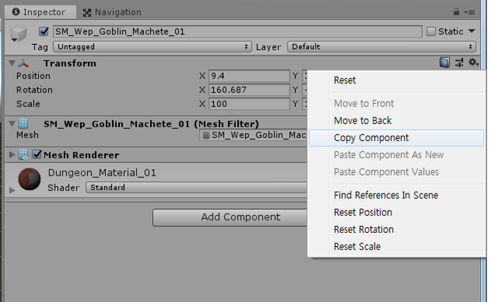 2.인스펙터창에서 이름 오른쪽의 Static를 체크한다.