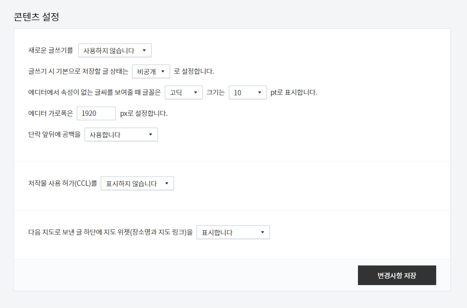 콘텐츠 설정 > 새로운 글쓰기를 사용하지 않습니다.를 선택하면 예전 글쓰기 에디터를 사용할 수 있다.
