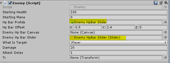 적의 인스펙터창 > Enemy 컴포넌트 > Hp Bar Prefab, Enemy Hp Slider에 각각 EnemyHpSlider Prefab을 할당한다.