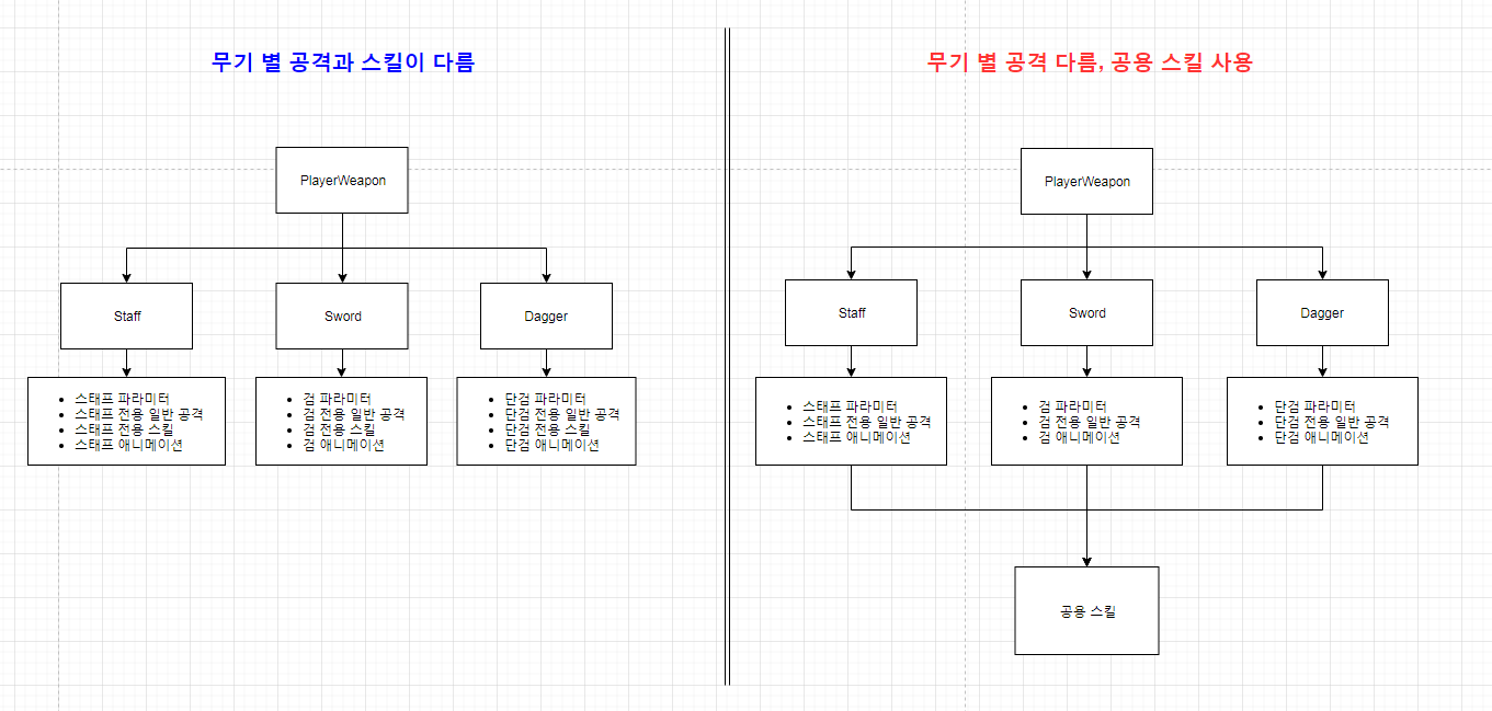 무기에 따라서 공격 애니메이션과 스킬들을 다르게하여 새로운 액션의 재미를 주고 싶었고(액션성, 다양성, 다크소울에 영향 받음), 새로운 주무기를 추가한다고 했을 때 손쉽게 확장할 수 있을 것 같아서(확장성) 무기 별 공격과 스킬이 다른 구조로 선택했다.