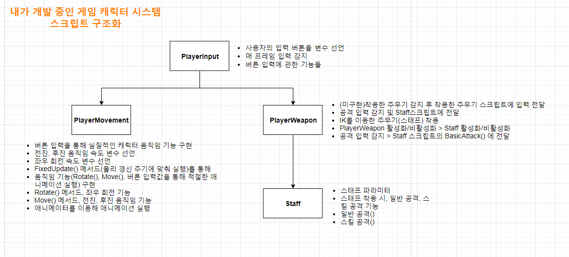 PlayerWeapon과 Staff 스크립트 구조를 생각할 때, 무기 상관없이 공용 스킬을 사용할지, 무기에 따른 공격과 스킬을 다르게 할지 고민을 했는데 아직 실력이 부족해서 스태프 이외의 주무기 기능은 구현하지 못하지만,
