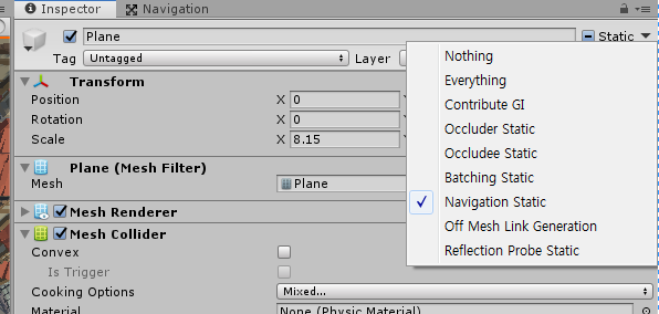 네비 메쉬를 생성할 오브젝트(주로 Plane)을 선택하고 인스펙터창의 Static에서 Navigation Static을 선택한다.