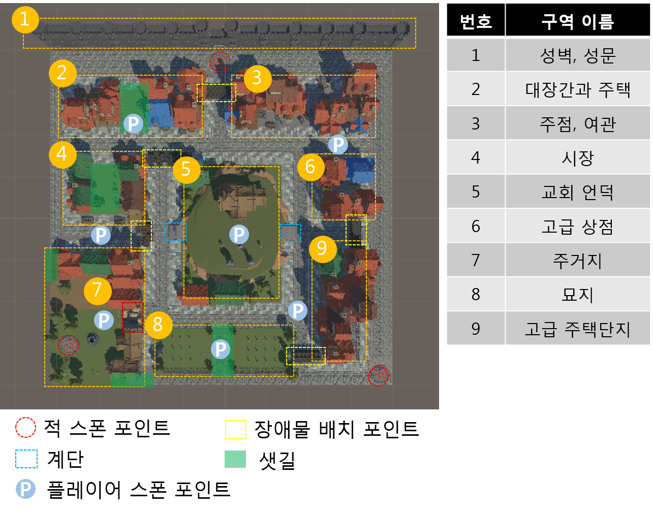 - 플레이어 스폰 포인트: 게임 시작 시 플레이어가 스폰하는 구역