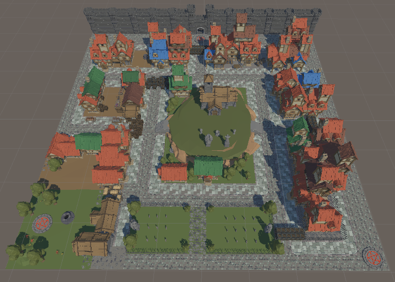 가지고 있는 에셋의 건물들이 빨간 기와가 있어서 돈 좀 버는 상업도시 느낌으로 컨셉을 잡았다. 중세시대에 중요한 건물인 교회, 광장을 중심으로 그려봤다. 초기에는 적 스폰 위치를 4군데로 하려고 했으나 그렇게 되면 너무 맵이 사각형이라 동일한 전투 패턴을 보여줄 것 같아서 비대칭적인 구조로 비틀어봤다. 교회를 바깥에 배치하니 맵이 작은 것 같아서