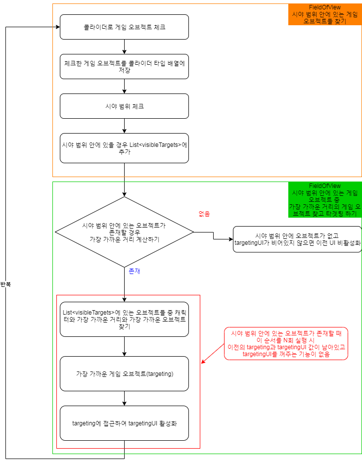 문제 원인 파악과 플로우 차트를 통해서 Field Of View와 타겟팅 시스템이 N회 실행 시