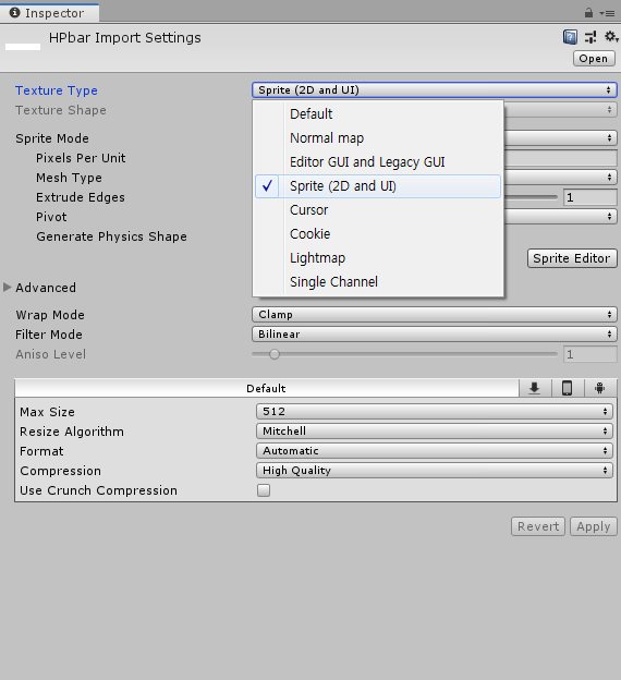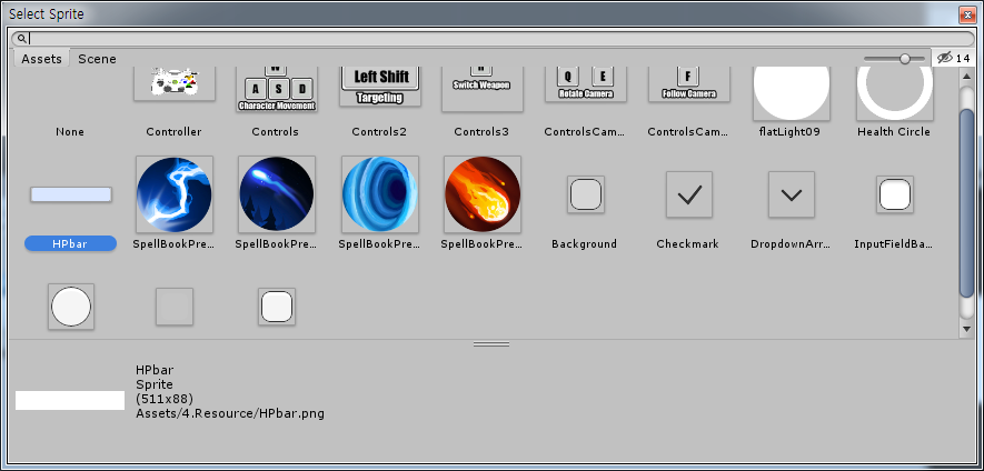가끔씩 사용할 이미지가 안 보이는 경우가 있는데 이때는 Project에서 해당 이미지 리소스를 선택하고 인스펙터창에서 Texture Type을 Sprite (2D and UI)를 선택하고 Apply를 하면된다.