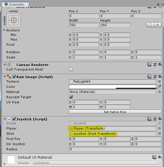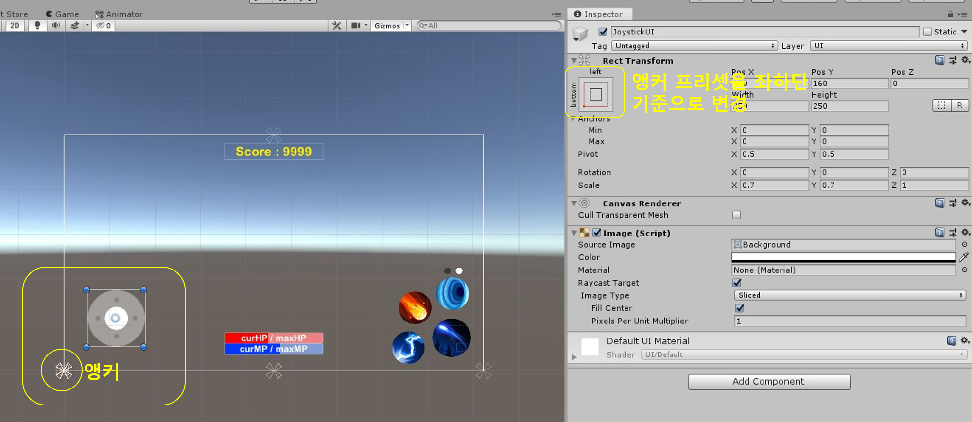 Pos X, Y를 변경하면 앵커를 기준으로 JoystickUI의 위치를 변경할 수 있다.