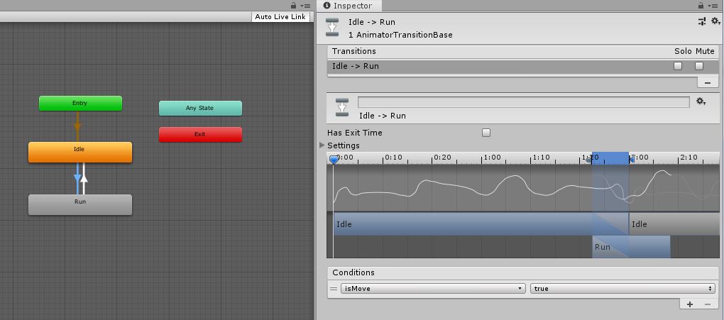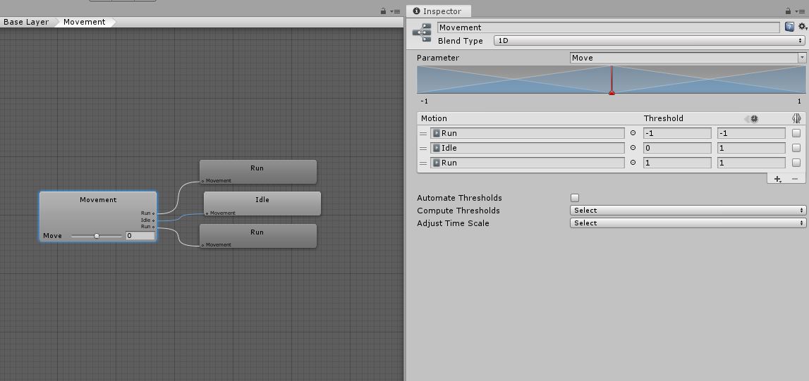 Movement 상태에서 float 타입의 Move 변수로 Input값에 따라서 Idle, Run 애니메이션을 실행하던 것에서 Bool로 Idle과 Run 상태 변경을 구현하기 위해서 Movement 블렌드 트리에서 Idle, Run 상태를 분리했다.