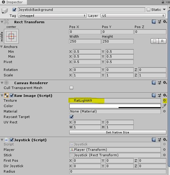 완성된 Joystick 스크립트는 JoystickBackground 오브젝트에 추가한다. Joystick의 빈 컴포넌트 필드에 맞게 Player오브젝트, Joystick 오브젝트를 넣어준다.