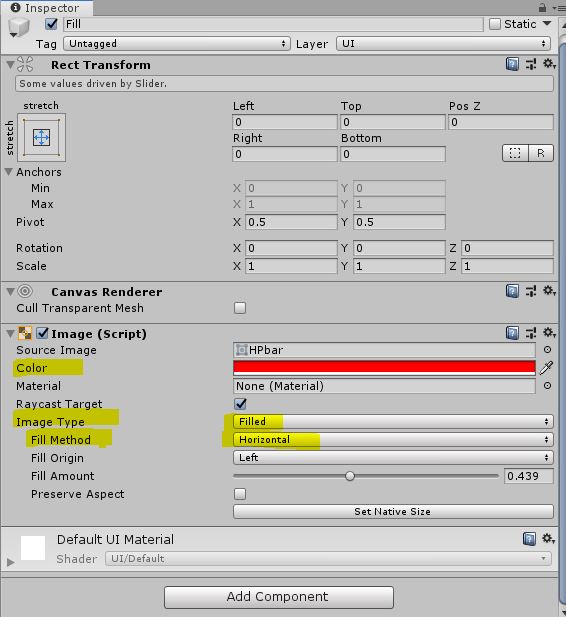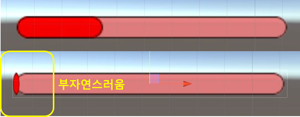 기본 UI 리소스를 이용하면 filled로 채울 때 부자연스러운 문제가 있다. 그래서 HpBar 리소스(이미지)를 새로 만들어서 Slider의 Background와 Fill area의 Fill 오브젝트의 리소스를 내가 만든 HpBar 리소스로 변경했다.