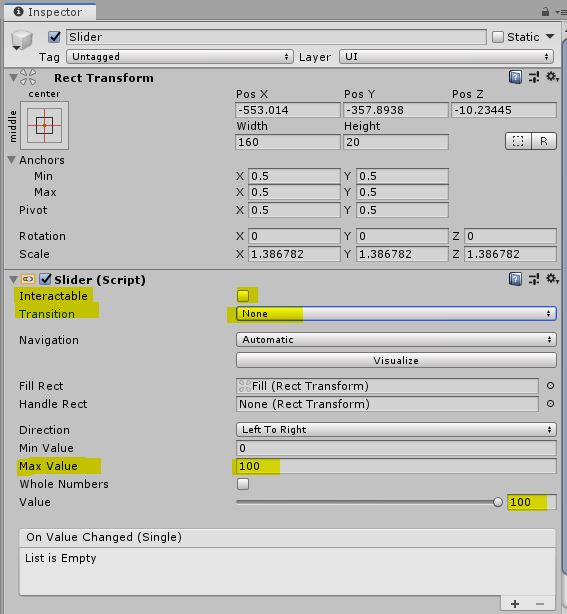 HpBarUI의 Slider의 인스펙터창 > Slider 컴포넌트에서 Interactable를 체크해제, Transition을 None하여 터치 상호작용을 꺼준다. 그리고 Max value를 100으로 변경하여 Slider의 최대값을 설정 해준다. Value 값을 움직이면 Slider 채움 상황을 확인할 수 있다.
