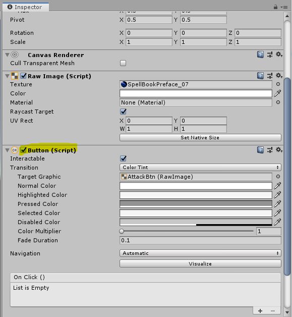 HUD Canvas의 자식 오브젝트로 ButtonsUI 패널을 생성하고 Raw Image 오브젝트를 4개 추가했다. 각각 이름을 AttackBtn, TeleportationBtn, Skill1Btn, Skill2Btn으로 이름을 변경했다. 위의 HpBarUI를 만드는 것처럼 원하는 리소스 이미지를 각각 변경했다. 이번에는 버튼 기능이 있어야 해서 Button 컴포넌트를 추가해줬다.