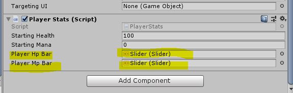 Player 오브젝트에 PlayerStats 스크립트를 추가하고, 빈 컴포넌트 필드에 각각 HpBarUI의 Slider, MpBarUI의 Slider 오브젝트를 연결하였다.