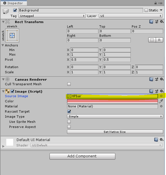 HP라는 것을 쉽게 인지할 수 있도록 HpBar의 색을 빨간색으로 정했다. Background의 색은 HP가 비어있음을 보여주기 위해서 HP의 빨간색보다 연한색으로 선택을 했고 Fill의 색은 빨간색으로 선택했다. Fill에서는 색이 채워지는 방법을 정할 수 있어서, Image Type을 Filled 채우기로 변경 > Fill Method를 Horizontal 수평으로 변경하여 좌우로 색이 채워지도록 했다. 채워지는 시점은 Fill Origin에서 정할 수 있다. 왼쪽에서 오른쪽으로 색을 채울려고 했기 때문에 기본값인 left로 두었다.